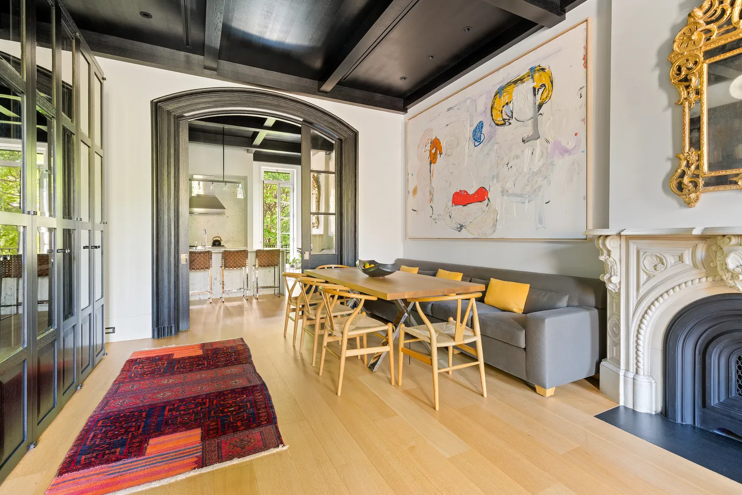 Begin with a classic entry hall featuring black-and-white marble floors, original plasterwork, and a sweeping staircase. Inside, the double parlor features 11-foot ceilings, oversized landmark-approved windows, 7-inch wide-plank oak floors, and original details including arched doorways, mirrored pocket doors, and a striking coffered oak ceiling. The space comfortably fits both a large seating area and a full dining table.