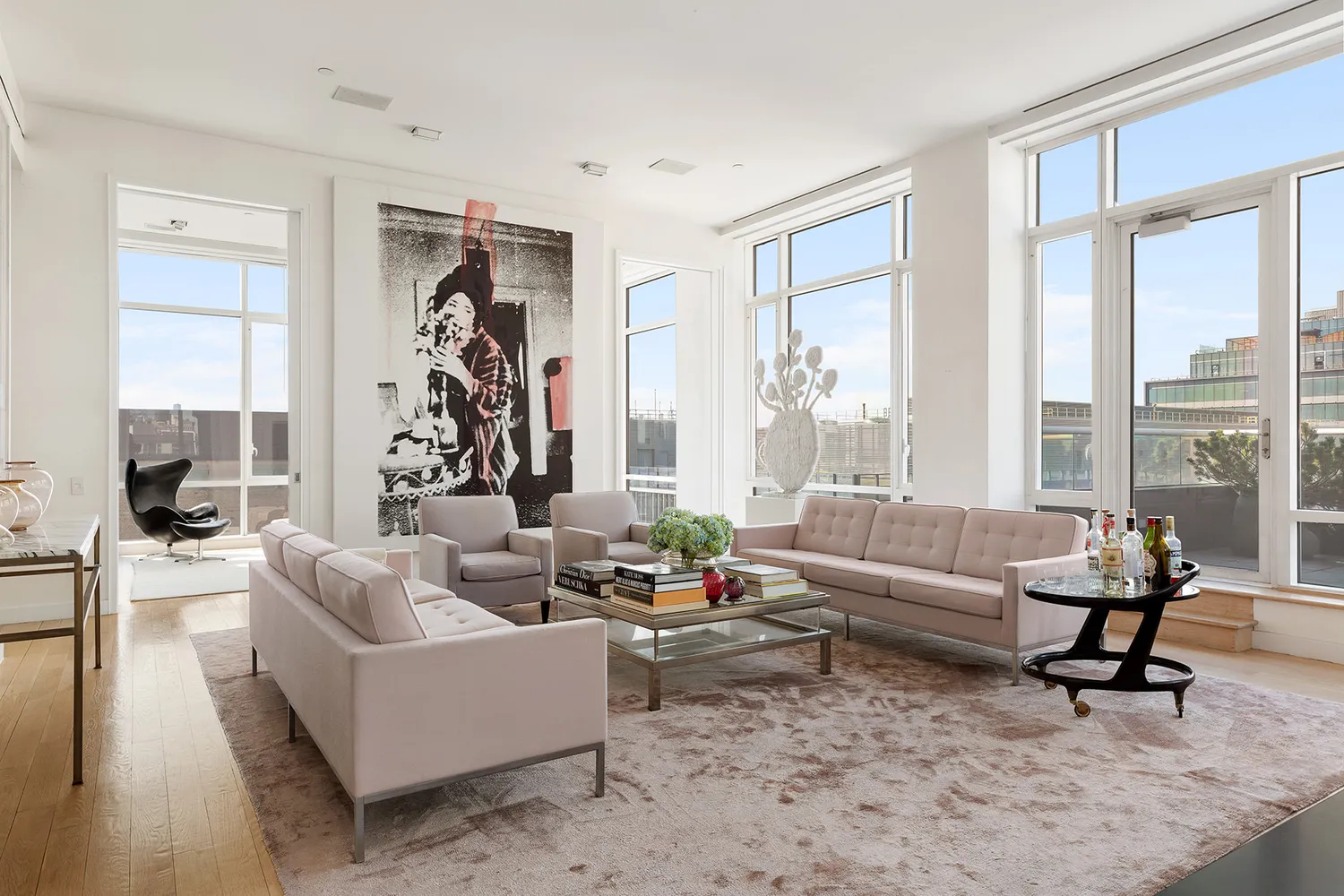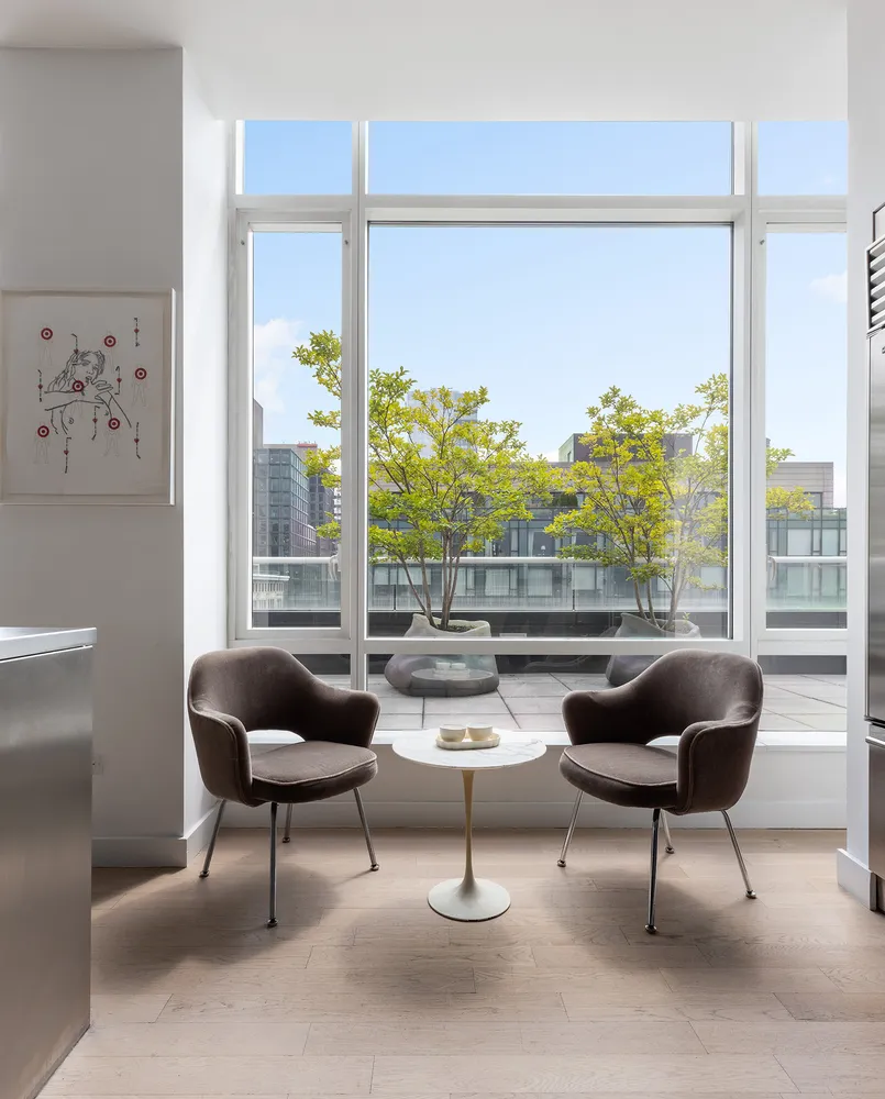 The grand entertaining space includes multiple access points to the north and east terrace. Wrapping a third of the entire apartment, this terrace features multiple seating areas, an outdoor dining room, and views spanning from the Empire State Building to the Freedom Tower.