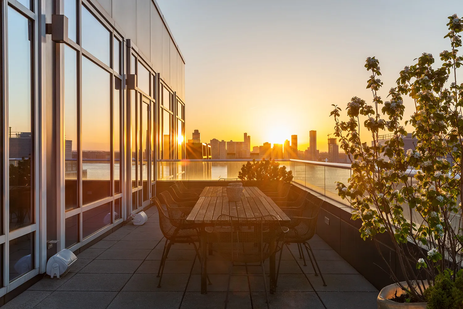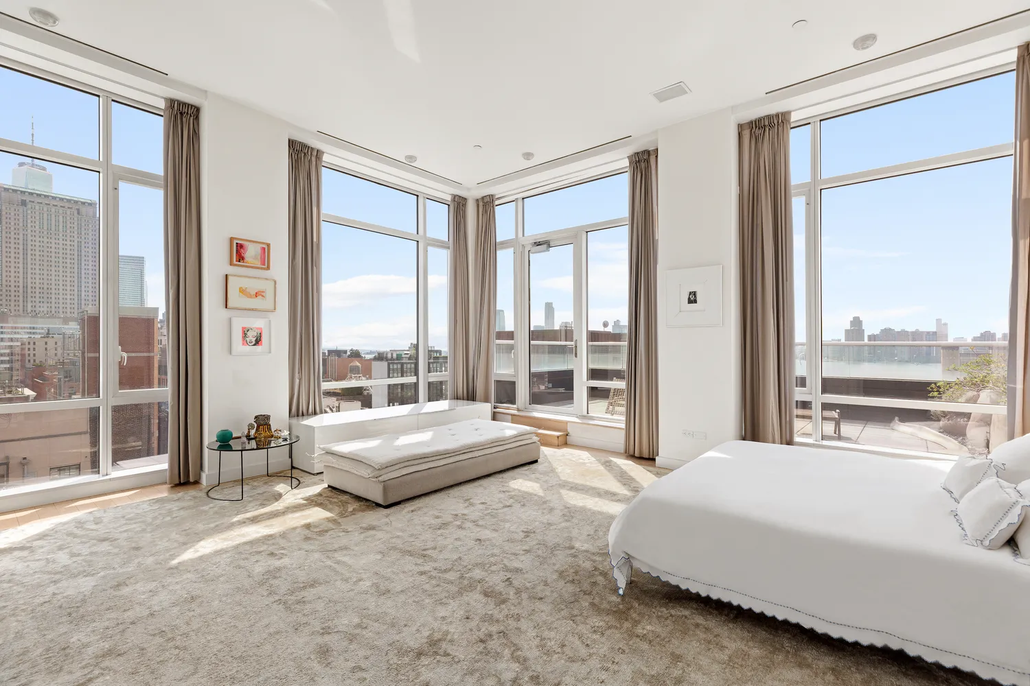 The first two bedroom suites share a jack-and-jill bathroom with a separate soaking tub and stall shower. The first bedroom has one of two access points to the west terrace. In addition to its immaculate sunset and river views, the west terrace has multiple seating and lounging areas. Views include downtown landmarks, spanning all the way to the Statue of Liberty.