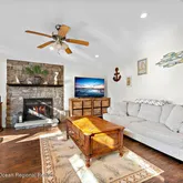 - Living Room: Fireplace - Woodburning, Sliding Door, TRY/VLT/CATH, Floor - Wood