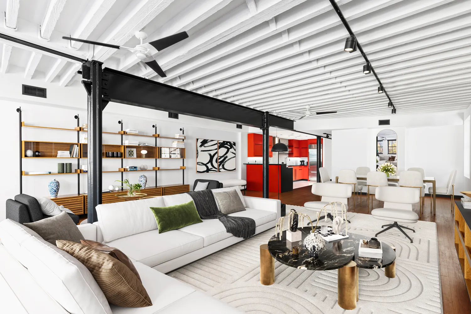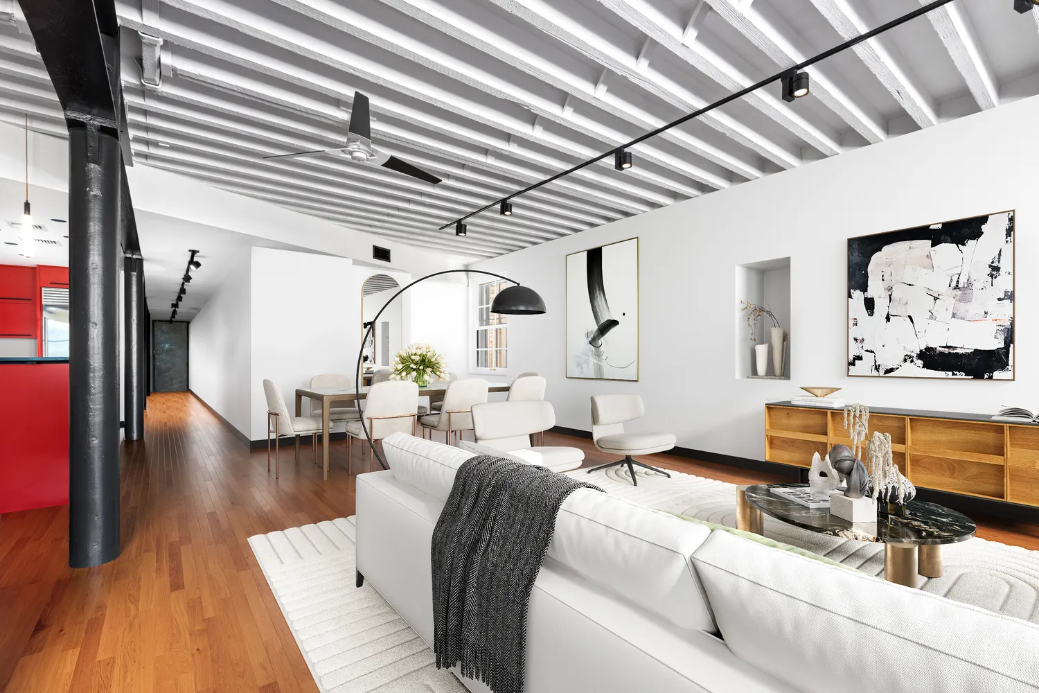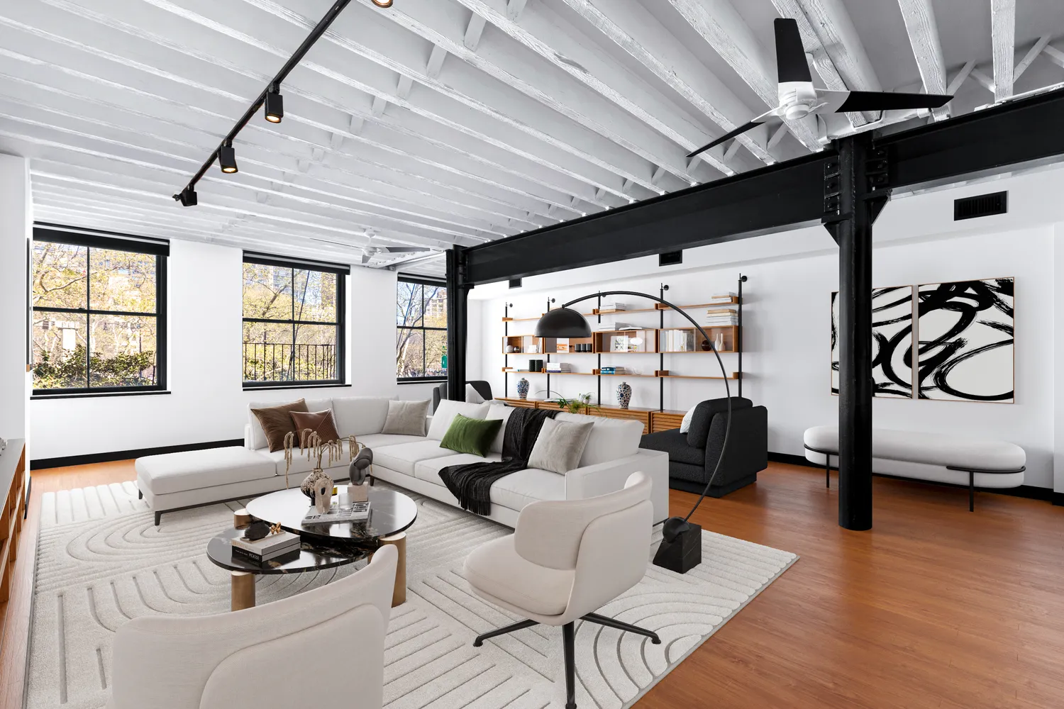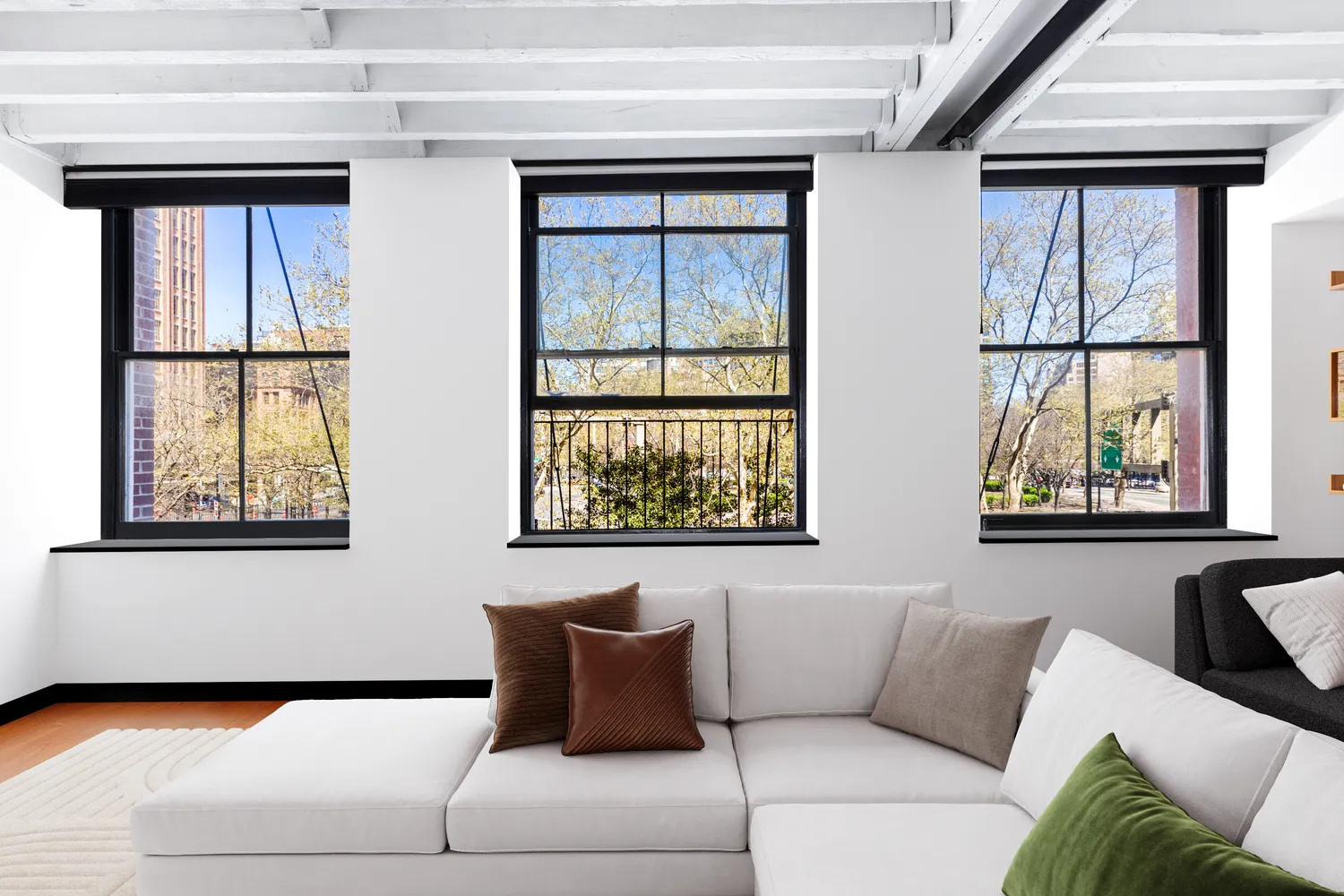 This is your Tribeca Dream Loft coming true… FULLY RENOVATED loft with soundproofing and a WOOD BURNING FIREPLACE as well as a Parisian style Juliet Balcony. Surprise yourself with tons of light, two exposures, and mega space in this impeccably maintained, historic Tribeca loft. Ideally situated in its beautifully converted 1910 warehouse building, this winsome, North and East-facing, flexibly planned (see alternate floor plan) condo loft home with original beamed ceilings and a wood-burning fireplace will turn your head and warm your heart. The GREAT ROOM truly is great has has room for about 100 if you wish to host. Additionally, the oversized CASEMENT bright picture windows set your backdrop with gorgeous leafy views of mature trees. There is enough space here to capture a bonus room – another sleeping space for your expanding needs (see alternate floor plan) – while never dwarfing the large living/dining room. The SLEEK CHEFS kitchen was just totally transformed and complements this extraordinary and dramatic space.