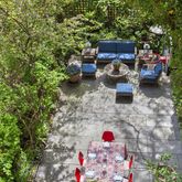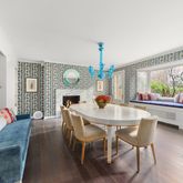 Arrive through an inviting vestibule and foyer to take in lovely cerulean blue details that act as a consistent, whimsical design theme throughout the home. The sunny eat-in kitchen and large butler's pantry contribute to lively entertaining with glass-front cabinetry, marble counters and a full suite of stainless steel appliances, including a Bertazzoni range, triple ovens, dishwasher, wine refrigerator and built-in microwave. Enjoy casual dining at the kitchen window banquette, or head to the formal dining room to find delightful window seats and a marble fireplace. Just outside, the south-facing fairy tale 45-foot sun-filled garden makes outdoor lounging and al fresco entertaining irresistible.