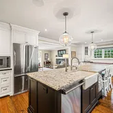 A picturesque bluestone path and inviting front porch lead to a stunning custom wood front door by Wolfe & Hale, setting the tone for the exquisite craftsmanship within. Inside, the foyer impresses with rich random width hardwood floors, wainscoting and crown molding, creating a warm and sophisticated welcome. On the left, the living room boasts a bow window (new Pella Architectural Series in 2018), recessed lighting, and a striking stone fireplace with new mantle, offering the perfect space for gathering. Seamlessly flowing into the chef’s kitchen, you'll find custom inset cabinetry by Village Handcrafted, a sideboard with a mix of black leathered granite and wood flanked by pantry closets, a large island of honed granite with farmhouse sink, two glass globe pendant lights and seating for four. Top-of-the-line Viking stainless appliances including a 6-burner range with a vented hood, dishwasher, refrigerator and built in microwave. Random width pegged hardwood floors complete the space.Take two steps down into the dining room, where a wall of windows overlooks the private backyard. Thoughtfully designed with a beadboard ceiling, built-in sound system, original slate stone floors, and a stylish drum light fixture, this room is ideal for both family dinners and grand entertaining. A glass door provides access to the bluestone and brick patio (repointed in 2024) with a stone seating wall, leading to a professionally landscaped fenced yard. Back inside, a few steps down from the foyer and through glass french doors is a spacious Family Room (currently used as an office). Nearby is the large laundry room with beautiful cabinetry and a convenient private powder room. Head into the two story mudroom with an exposed stone wall, custom built-in cubbies, a family entry door to the front and access to the oversized 2-car garage with a full wall of cabinetry.