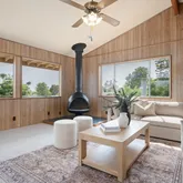 The downstairs area boasts a light-filled living room with vaulted ceilings, four bedrooms, and two bathrooms. In the 1980s, the owners completed a significant addition, expanding the pantry and laundry areas, and adding a second story.