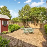 Outside, the tranquility of the backyard beckons, enveloped by lush greenery. Relax and unwind on the hardscaped patio, perfect for al fresco dining. A convenient shed adds practicality to this serene outdoor oasis.