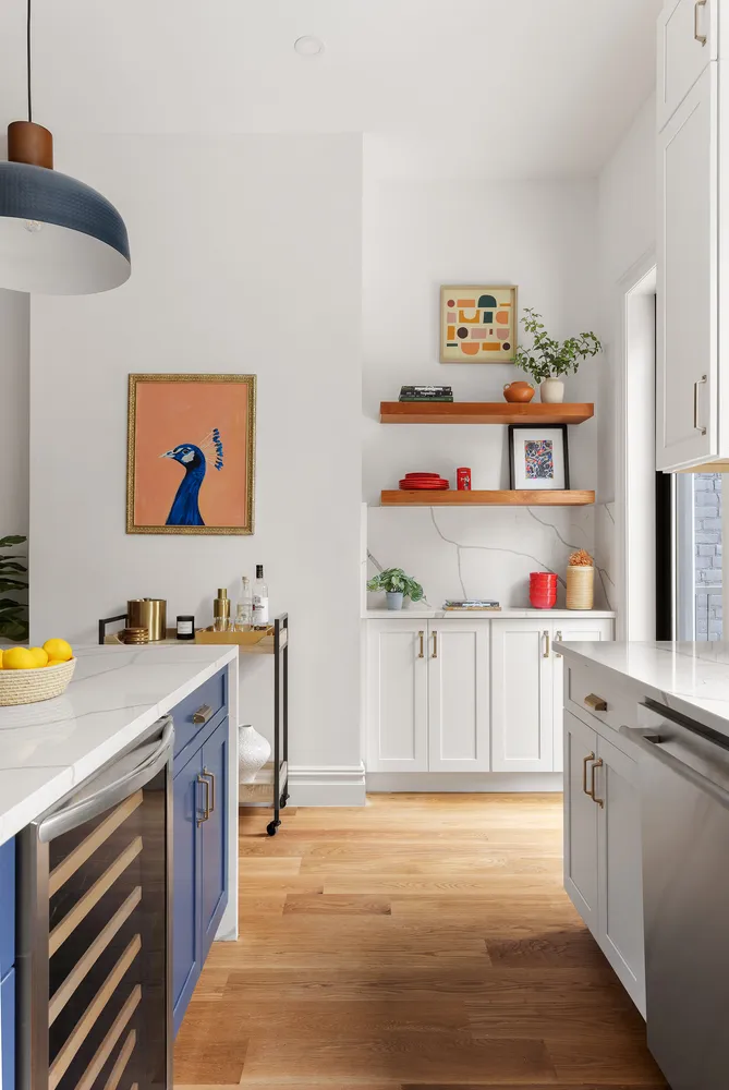 As you enter the owner’s three-bedroom duplex, you are greeted by an open layout with oversized windows looking out to the serene backyard. Stepping into the 20 feet wide parlor, you realize the breadth of space and tall ceilings that let the light radiate throughout the open floor plan. To the left, a formal living room area offers a great space for entertaining. To the right, a thoughtfully designed powder room. In the back, your dining and open kitchen features a four-seat island, custom cabinetry, and quartz countertops. With a farmhouse sink and a full complement of Thermador appliances including an integrated 36" French door refrigerator, dishwasher, six-burner stove and wine cooler this kitchen is this home's centerpiece.