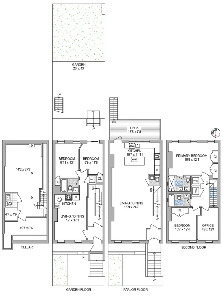 The private cellar can be accessed through the inner staircase from the living room and is finished with textured tile floors and a powder room. It can easily be transformed into a playroom, home office, or artist studio. The separate garden floor apartment features two-bedroom and one bathroom and can serve as an income-producing property or in-law apartment. The garden unit is equipped with a washer / dryer in the unit and shares access to the large backyard.