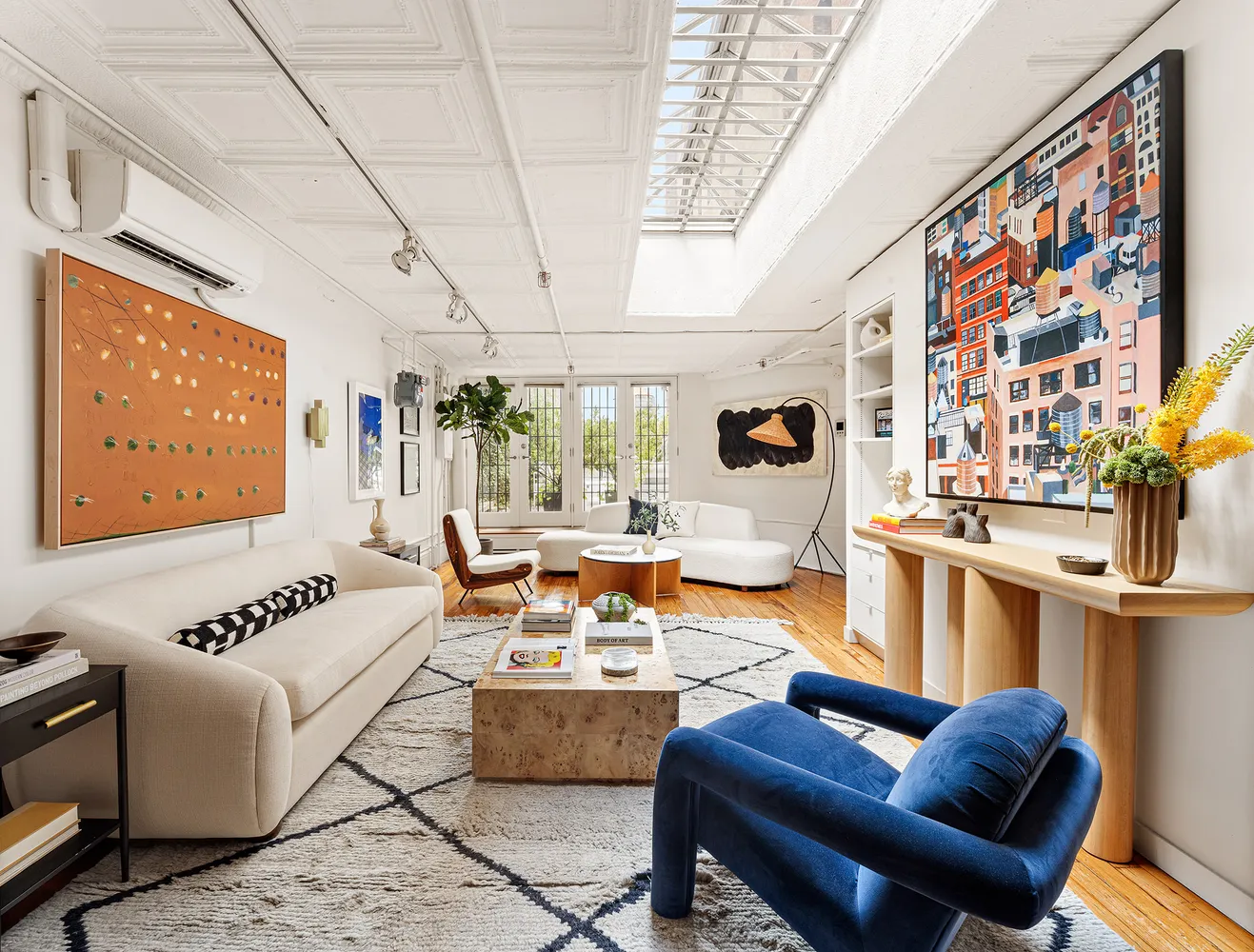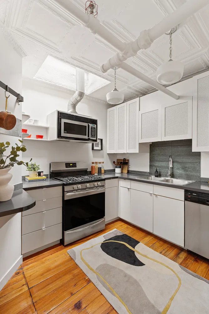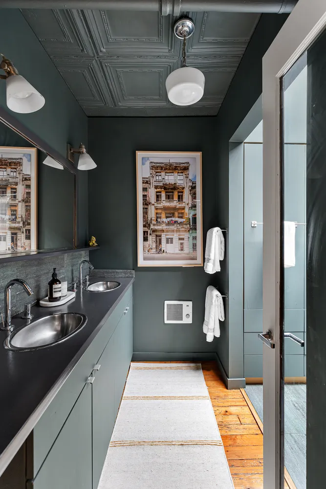 Accessed directly from the key-locked elevator, the loft apartment features hardwood floors, original tin ceilings, five skylights, and private access to the gorgeously landscaped roof deck. The enormous primary bedroom overlooks a charming Juliette balcony with views over Soho. There is a separate home office with skylight. The large kitchen has a gracious pantry and opens to a dining area, with the living room beyond. There is a large full bathroom with double vanity, and also a separate powder room.