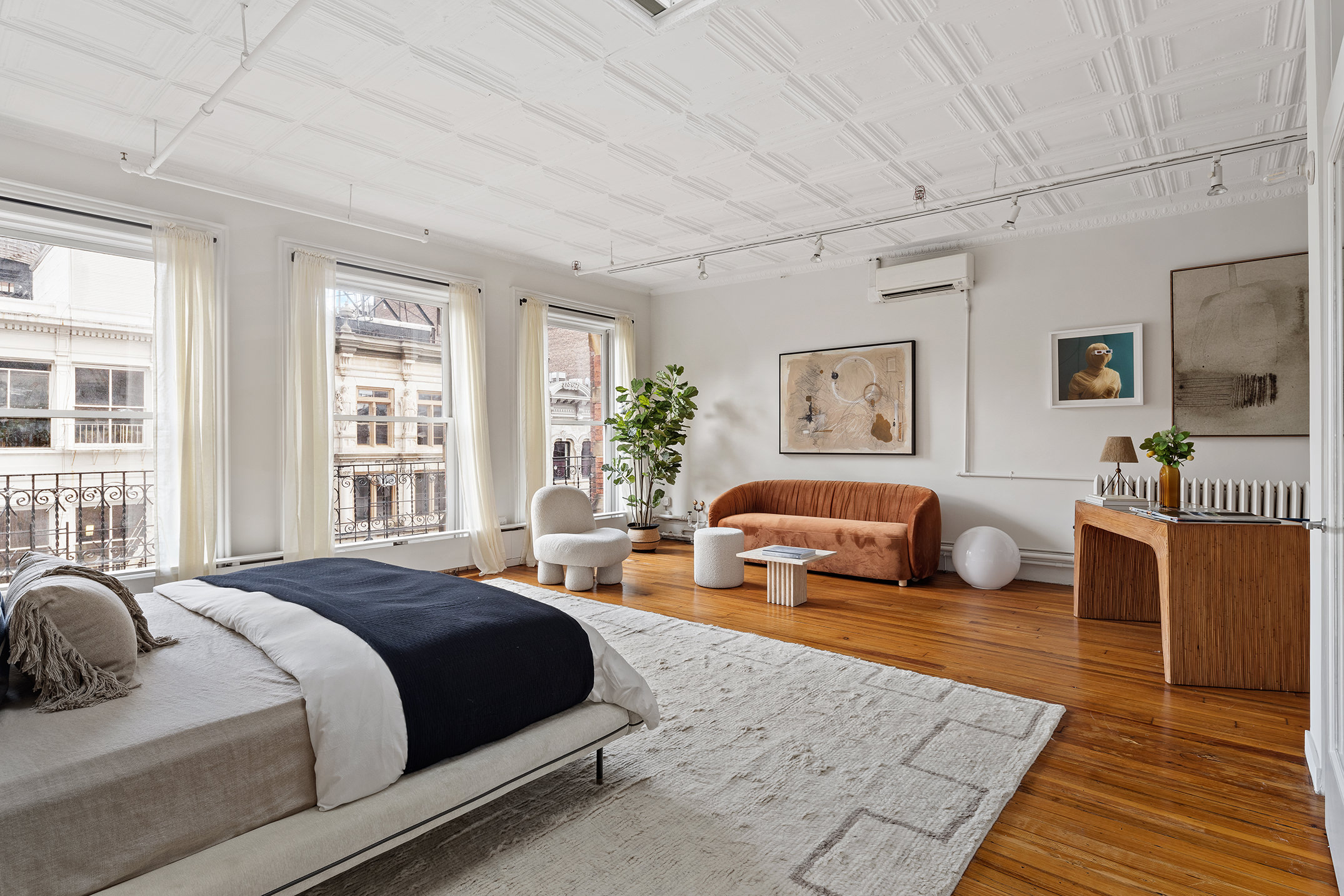 Accessed directly from the key-locked elevator, the loft apartment features hardwood floors, original tin ceilings, five skylights, and private access to the gorgeously landscaped roof deck. The enormous primary bedroom overlooks a charming Juliette balcony with views over Soho. There is a separate home office with skylight. The large kitchen has a gracious pantry and opens to a dining area, with the living room beyond. There is a large full bathroom with double vanity, and also a separate powder room.