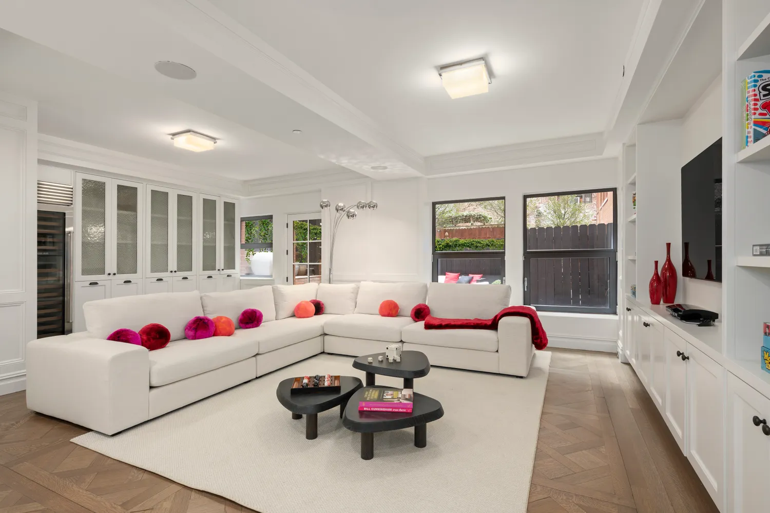The garden level offers a sizable and super-versatile media and entertainment space, with plenty of room for a comfy couch and big-screen TV. This level also boasts a large wine fridge, separate home office, laundry room with full-sized washer and vented dryer and extra storage, a full bath, and 463 square feet of decked patio.