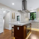 The gourmet kitchen is a chef's dream, featuring top-of-the-line appliances, including a GE Café induction stovetop with Zline hood, GE Café oven, 5-in-1 convection oven/microwave, smart refrigerator/freezer, Bosch dishwasher, filtered water faucet and filtration system, garbage disposal, sleek quartz countertops, and custom cabinetry with a "super susan" feature. The cabinets feature illuminated glass fronts and toe kick lights adding a touch of elegance. The cabinet hardware and plumbing fixtures beautifully complement the kitchen's design. Adjacent to the kitchen, just beyond the door to the backyard, a charming powder room awaits, adorned with a custom marble sink and stunning wallpaper, offering both style and convenience.