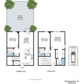 As you make your way up to the upper level, you will find a master bedroom with his and hers closets and an en-suite bath. This corner bedroom has many windows and gets a ton of natural light. The large second bedroom is also on this floor and has an adjacent full bath. This unit was originally built and is convertible to be a 3 Bed, 3 Bath apartment. A covered, deeded parking space is included in the sale.