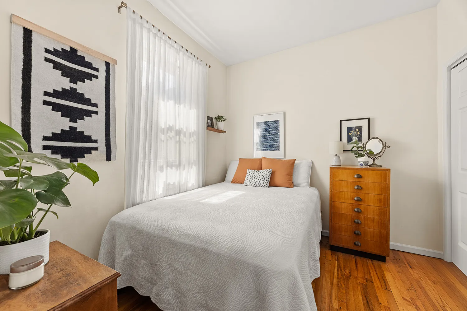 The primary bedroom, currently used as a music studio, fits a king-sized bed. The two smaller bedrooms are ample in size, one set down the hall for maximum quiet and privacy, and could also easily be used as office spaces or guest rooms. A very low maintenance, triple exposure, and an in-unit washer/dryer makes this special home even more attractive.