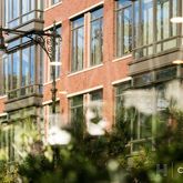 At 30 feet long, the great room is of magnificent proportions. Walls of windows lend triple exposure to the north, east, and south, capturing the lush landscape of vibrant trees and flowers. Set back from Washington Street, the great room peers over a fenced-in garden area for residents and neighbors to enjoy.