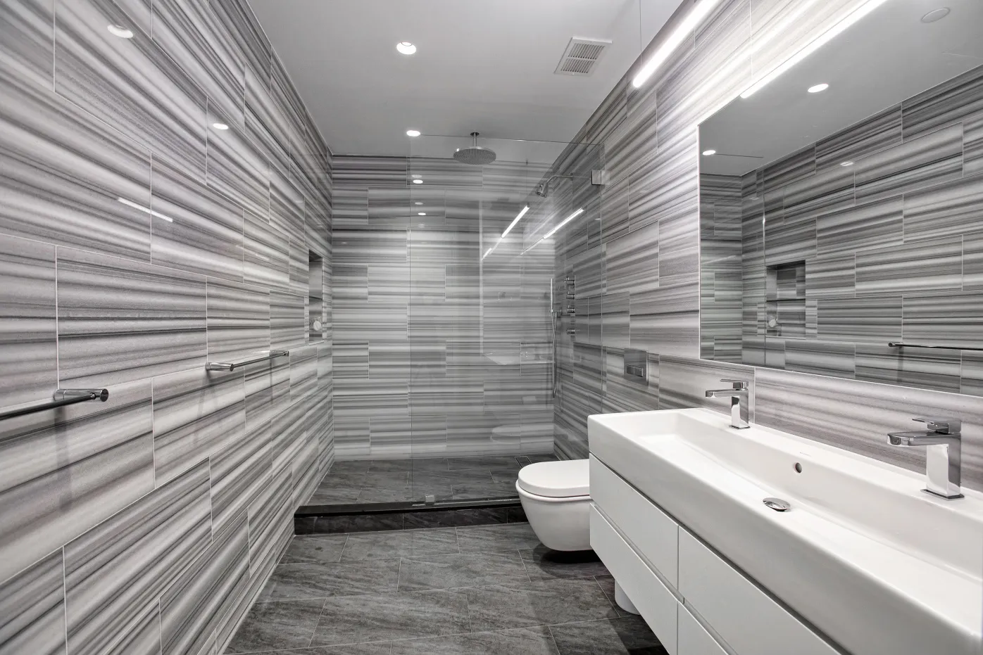 At the end of your expansive corridor, ideal for showcasing art, you'll find a lovely corner primary bedroom. This serene bedroom features a bank of walk-in customized closets and views of the iconic Cooper Union Foundation Building. The master bath is an oasis of tranquility outfitted with elegant marble, a custom rain shower, and a double sink vanity.
