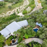 Designed to take full advantage of its stunning surroundings, the home features breathtaking river...Welcome to your hilltop haven in the heart of the Texas Hill Country—perched above the Blanco River, this one-of-a-kind Wimberley estate offers sweeping views, timeless charm, and an effortless blend of comfort and privacy. As you pass through the private gated entrance, you're greeted by lush natural beauty, a shady pool oasis, and the tranquil sound of a cascading waterfall from your very own pond.