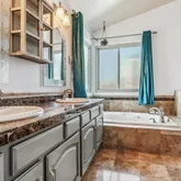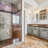- Room Description: Tile, 5 piece, jet action tub, tiled shower with glass doors