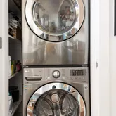 As a bonus, the foyer features a gracious double-closet with built-in overhead storage, a washer and dryer are conveniently concealed just off the kitchen, the guest bathroom has recently been renovated with features such as intricate opal chevron Nemo tile, custom cement sink, and vanity mirror with shelving. Additional renovations include Nest Smart Home thermostat, brand new, full-size LG TrueSteam washer and dryer, restoration hardware chandelier in living room, and new glass door, railing, concrete floor, solar lighting, and outdoor couch and lounge chair from Pottery Barn.