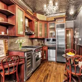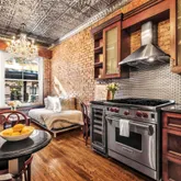 From the moment you step inside, you are greeted with original brick walls, an abundance of natural light and classic New York tin ceilings. The stunning kitchen is fully outfitted with top of the line appliances including, a Wolf range, dishwasher, built-in wine fridge, refrigerator, and GE microwave.