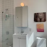 The living area is bright and open, showcasing the original fireplace mantle. The adjacent kitchen space is open layout in minimalist white, and has a gas stove, outside venting, fridge freezer, and lots of counter space and outlets. There is a large storage room with door, adjacent to the kitchen, which can be used for extensive storage or as a home office nook. The one bedroom is large and configured as a master suite, with pocket doors both to a walk-in closet, and to a spacious and windowed en-suite bathroom with tub and shower. There is a glass door from the bedroom that opens to a Juliette “balcony” The 12ft ceilings and open layout create a spectacular high and long space. There are plenty of options for configuring both leisure and work spaces, and creating a multifunctional layout.