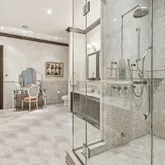 The home has a very private double-sized primary bedroom, with its own sitting room/home office area, private elevator, and enviable closets with dressing area. It features a unique, spa-like 20 x 14 bath with Jacuzzi for 2, Steam Shower for 2 and Lefroy Brooks fixtures.