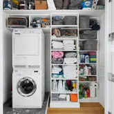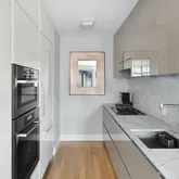 Enter the home through direct keyed elevator access into the closet-adorned entryway that flows directly into two expansive open concept living and dining areas. The floor to ceiling windows with northern and southern exposures allow for continuous light throughout the day. This smart layout also features Quartered oak floors, a custom designed laundry room and a second washer/ dryer, central air, and ample storage. Two deluxe semi-open galley-style kitchens designed by Snaidero are equipped with chic lacquered cabinetry, Venetino marble countertops and backsplashes, and a suite of high-end stainless steel appliances from Miele.