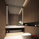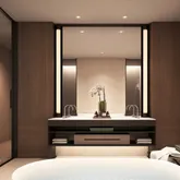 The master bedroom suite is a true sanctuary with southern exposures, and a spacious walk-in-closet with integrated lighting by Poliform. The double-height master bathroom features Perlado Beige marble radiant heat flooring, Perlado Beige marble and Augsburg oak paneled walls with tinted mirror accents, custom double vanity with integrated lighting, freestanding soaking tub, Perlado Beige marble shower with Dornbracht fixtures, and Toto Neorest water closet.