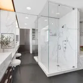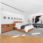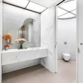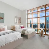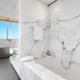 A glass and steel staircase just off the gallery makes for a grand entrance up to the second floor. The 2,000 square foot primary suite encompasses a sitting room and home office with custom Anigre wood built-ins and glass open to below to take in the views from one level higher. All of the rooms on the second floor feature Gwathmey’s modern twist of wooden built-ins purposely positioned in front of the windows, creating a contemporary yet warm facade through which to view the gorgeous city vistas. The primary suite consists of two luxurious baths; one en-suite and another towards the opposite side of the primary suite wing, each with their own dressing rooms. White statuary marble walls and sinks are complimented with radiant heated black granite floors. The second primary bath features gorgeous north-facing city views, radiant heated floors, dual sinks, a stand-up shower stall and a tub with a built-in TV. Adjacent to the second primary bath is the 52nd floor entrance to the residence making it easy to bring your luggage and packages up directly to the suite.