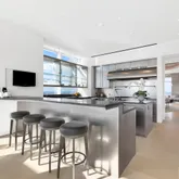 Upon entering this 9,000 SF, five-bedroom, six-and-a-half bath penthouse, you are welcomed by a magnificent living room with 24-foot high ceilings showcasing views of Manhattan to the north and west including Central Park. Gwathmey’s elegant, contemporary finishes throughout the residence include white Venetian plaster walls, maple floors, Anigre wood and stainless steel. The large dining room leads into the state-of-the-art chef’s kitchen, with counters of absolute black honed granite, a breakfast bar and a more casual dining area for additional seating. Adjacent to the kitchen is the media and entertaining room. The first floor also features a powder room, reception room, home office, pantry, ample storage/closets, two staff rooms with full bathrooms and a mechanical room.