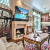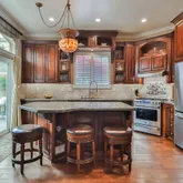 The Gourmet Kitchen features custom wood cabinetry, a large center island, Granite countertops, and Stainless-Steel Appliances, including a 6-burner gas range, Convection Oven, Microwave Drawer, and Refrigerator. The kitchen opens to the cozy Family Room with a Limestone Fireplace. The Lower Level features Distressed Wood Flooring - Custom Chandeliers in Kitchen and Dining Room - Bedrooms located on Second Level with Fourth Bedroom currently used as an Office - The primary en-suite features a Soaking Tub, Large Shower, Custom Wood Cabinetry, Dual Vanities, Dressing Area, Walk-in Closet, and Private Balcony just off the Bedroom Area - The Laundry Room is conveniently located on the Second Level - Outdoor Entertaining Areas feature a Flagstone Patio and Walkway, Waterfall Feature, Lush Landscape, and Covered Side Patio - A two Car Garage features Ample Storage Space and Epoxy Floors -