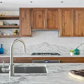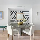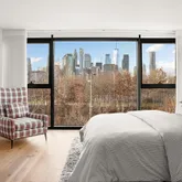 A generous entry foyer with an elegant powder room leads into the home's open, loft-like main level. The kitchen, dining, and living spaces combine seamlessly, with a wall of glass and perfect terrace looking out over the greenery of Brooklyn Bridge Park, the East River, and the Manhattan skyline beyond. The chef’s kitchen has been outfitted with a suite of Gaggenau appliances, solid walnut Pedini custom cabinetry, and Calacatta marble countertops & backsplash. While the views from the living room are stunning, the primary bedroom view is absolutely spectacular, with the lower Manhattan skyline framed by the river and greenery of the park below. What a fantastic place to wake up every morning! The spa-like en-suite bathroom features Waterworks fixtures and Ruscello Fosso Picollo marble floors with a deep soaking tub, double vanity, and separate shower. A wall of closets and a separate walk-in closet complete the glorious space. A comfortable second bedroom and full bathroom, as well and an enormous laundry room, offer extra storage and unparalleled convenience. The home’s floor-to-ceiling, soundproof windows are adorned with custom Hunter Douglas remote-controlled blinds.