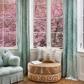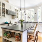 The front entry hall leads through a custom-built butler's pantry to the home’s stunning kitchen. This enviable kitchen, featuring hand-blown light fixtures by Alison Berger, can accommodate any level of chef: abundant custom cabinets, spacious Basaltina counter tops, a large center island, 48” Sub-Zero refrigerator, 48” Wolf stove and double oven, two Miele dishwashers, a 46-bottle Sub-Zero wine refrigerator, a built-in microwave drawer and a deep farmhouse sink. The entire west wall of the kitchen has extra-large bay windows, providing spectacular light and views of the back garden’s luxuriant foliage.