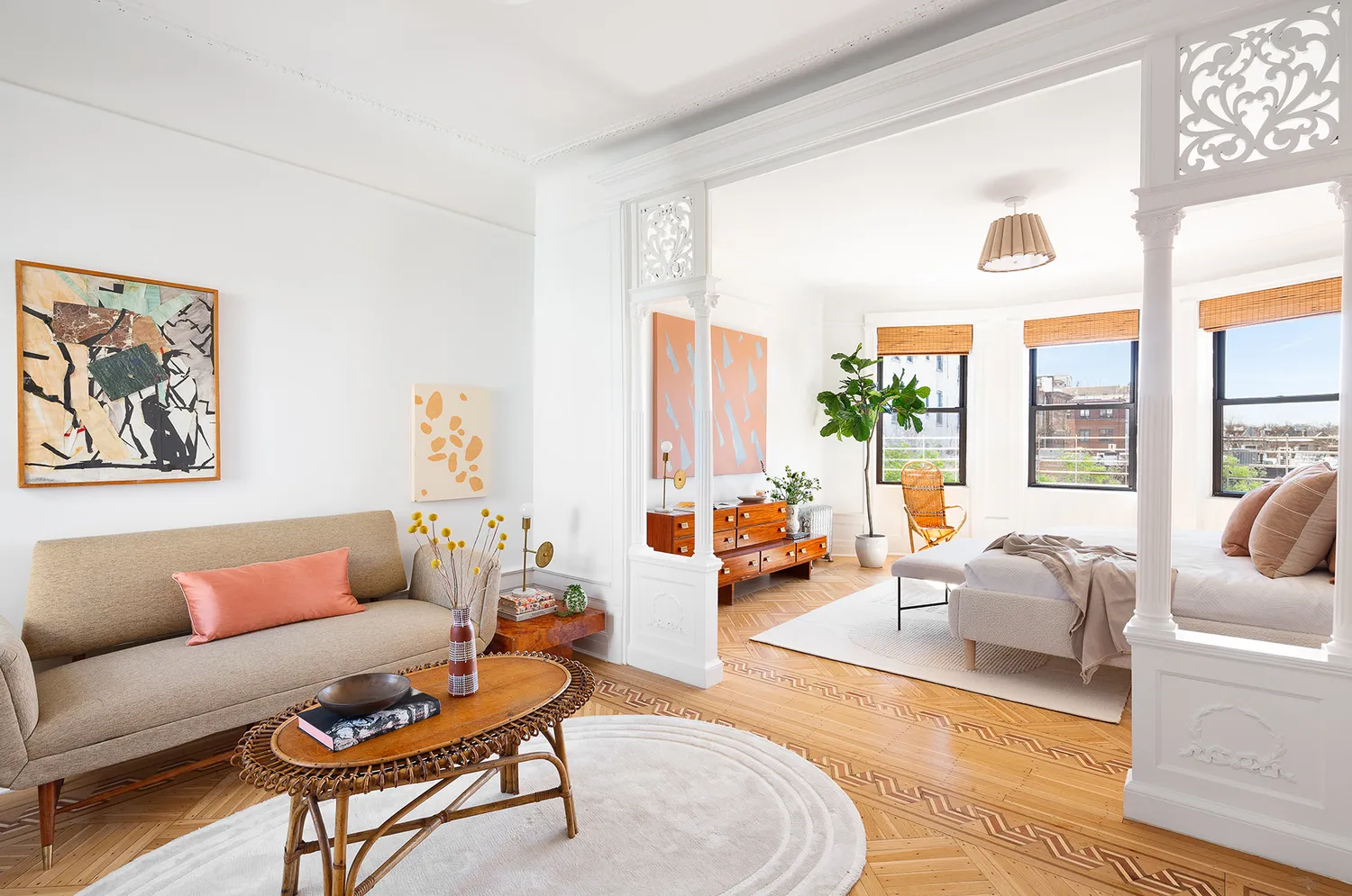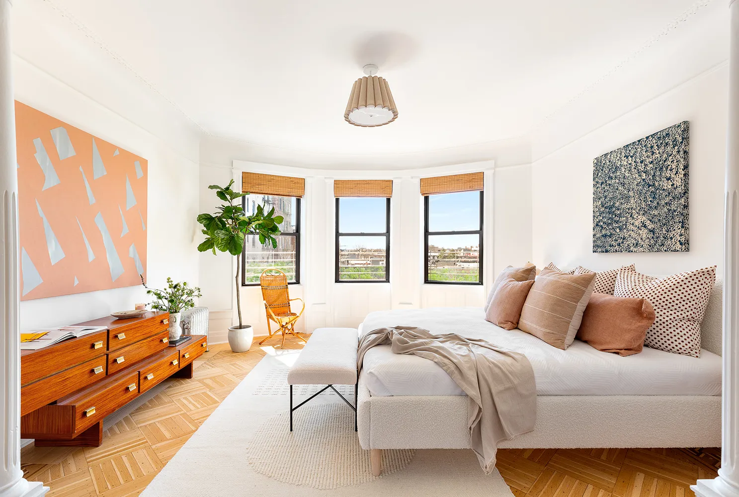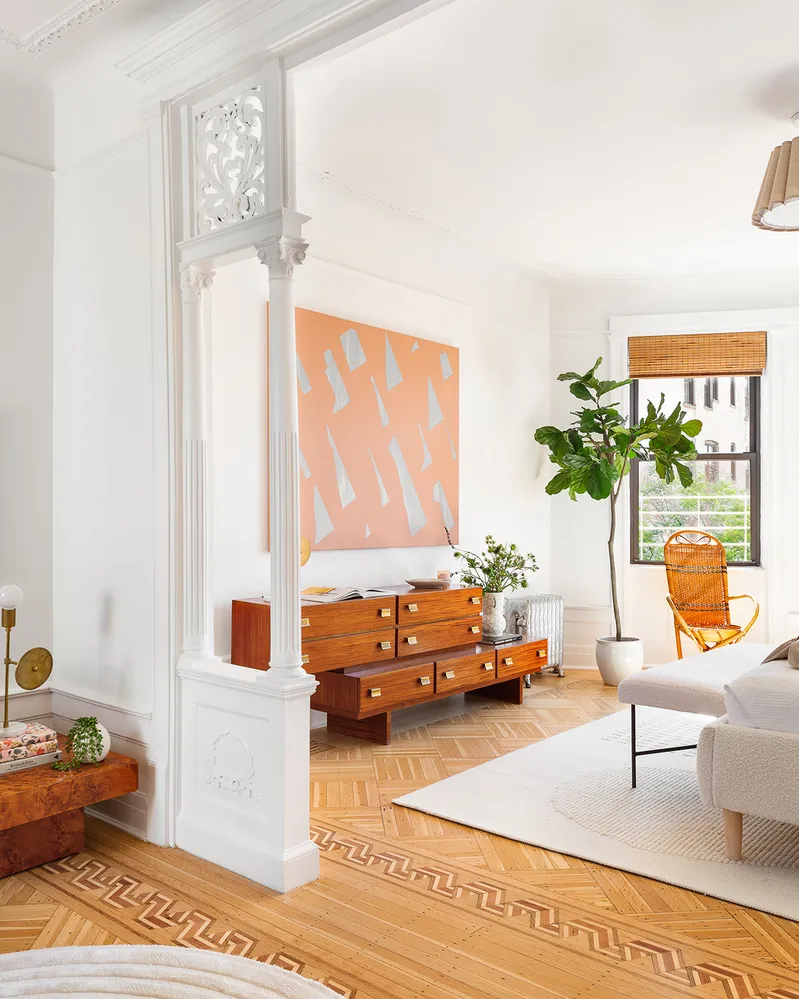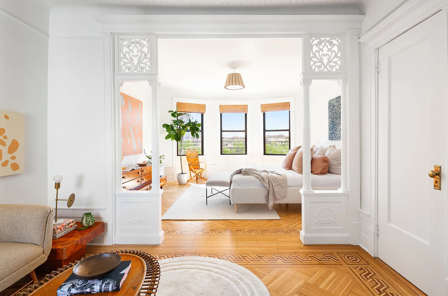 The floor-through layout is currently configured as a three-bedroom with a luxurious primary bedroom and attached sitting room and two large secondary bedrooms (both of which can fit king beds), all with details that bespeak the original period, from chair railings to original doors. The east-west orientation brings in moving light that floods the kitchen with morning sunshine, and crosses over to grace the primary and its peek of Prospect Park with afternoon sun and glorious panoramic sunsets, with a skyline that views all the way to the Verrazano bridge.