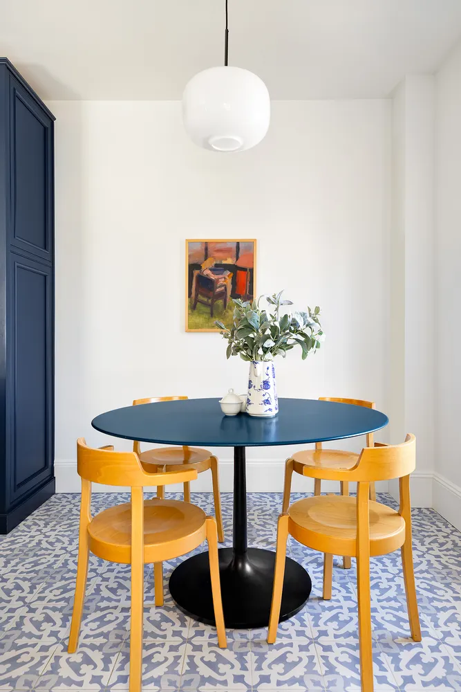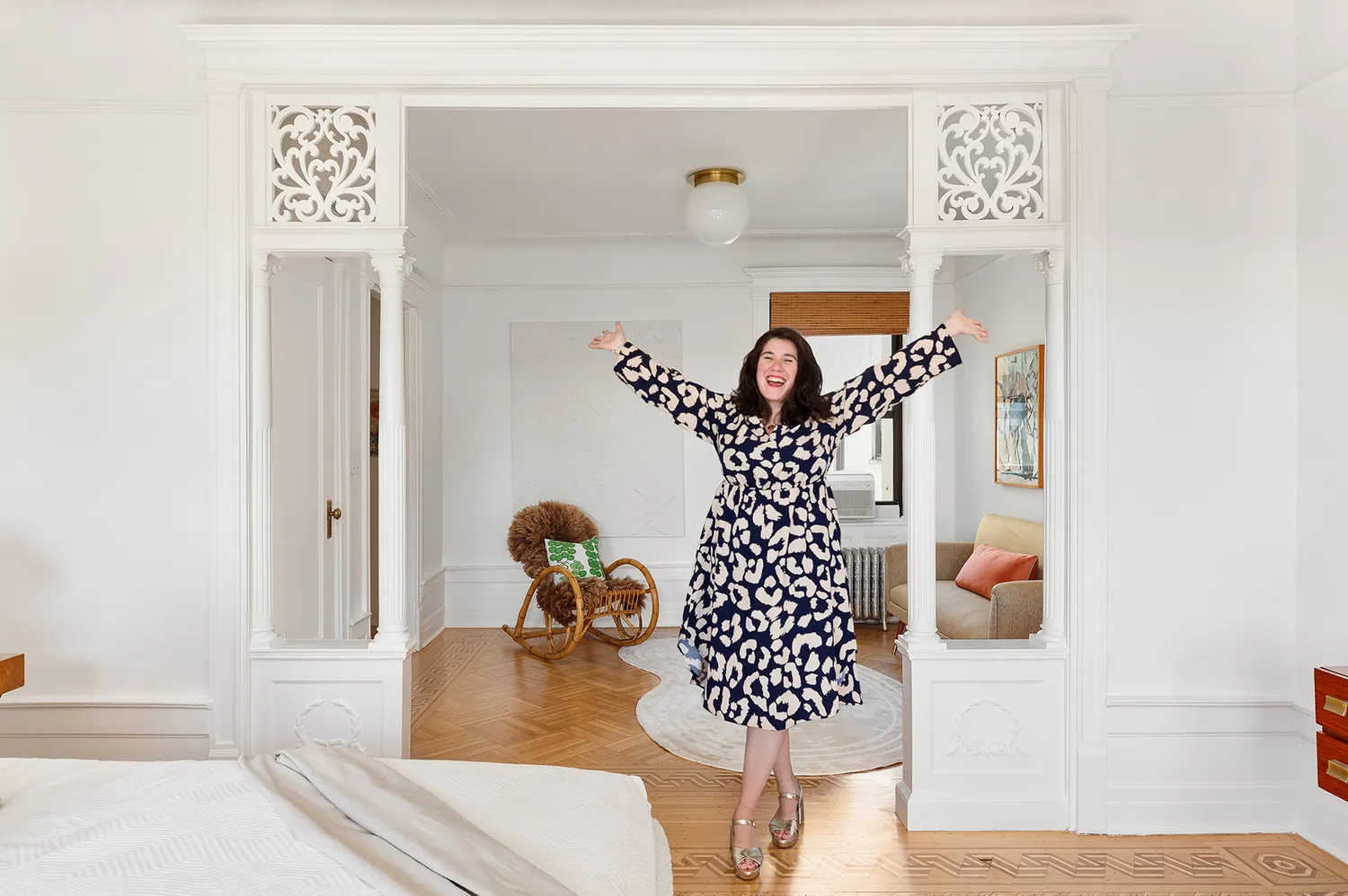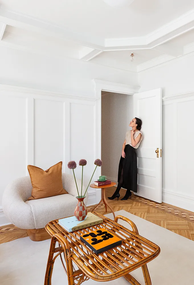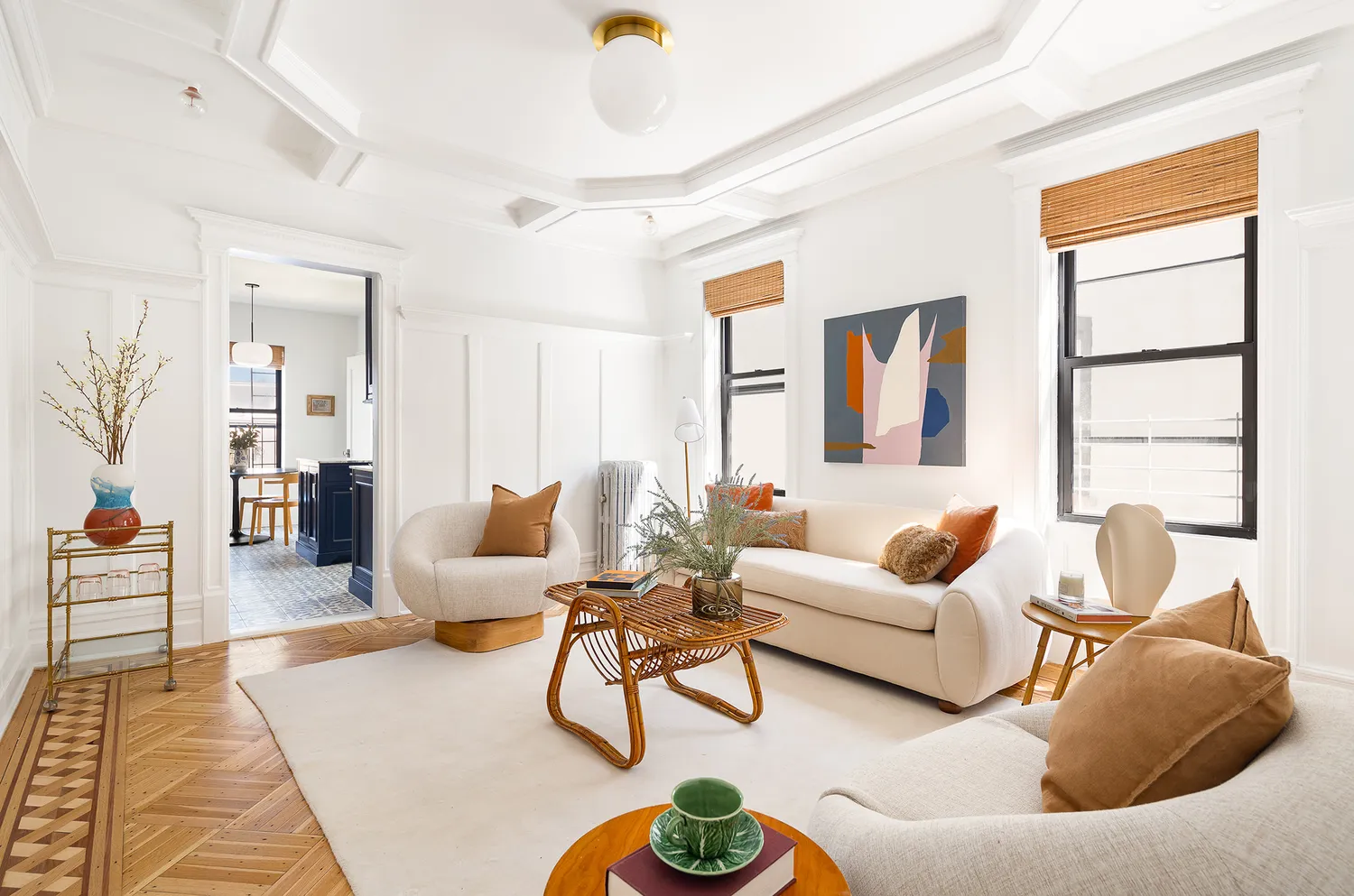 The floor-through layout is currently configured as a three-bedroom with a luxurious primary bedroom and attached sitting room and two large secondary bedrooms (both of which can fit king beds), all with details that bespeak the original period, from chair railings to original doors. The east-west orientation brings in moving light that floods the kitchen with morning sunshine, and crosses over to grace the primary and its peek of Prospect Park with afternoon sun and glorious panoramic sunsets, with a skyline that views all the way to the Verrazano bridge.