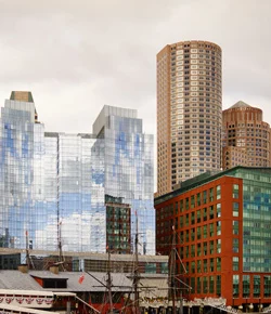 Luxury condominiums and high-end apartments abut Boston Harbor, forming a ring around the North End.