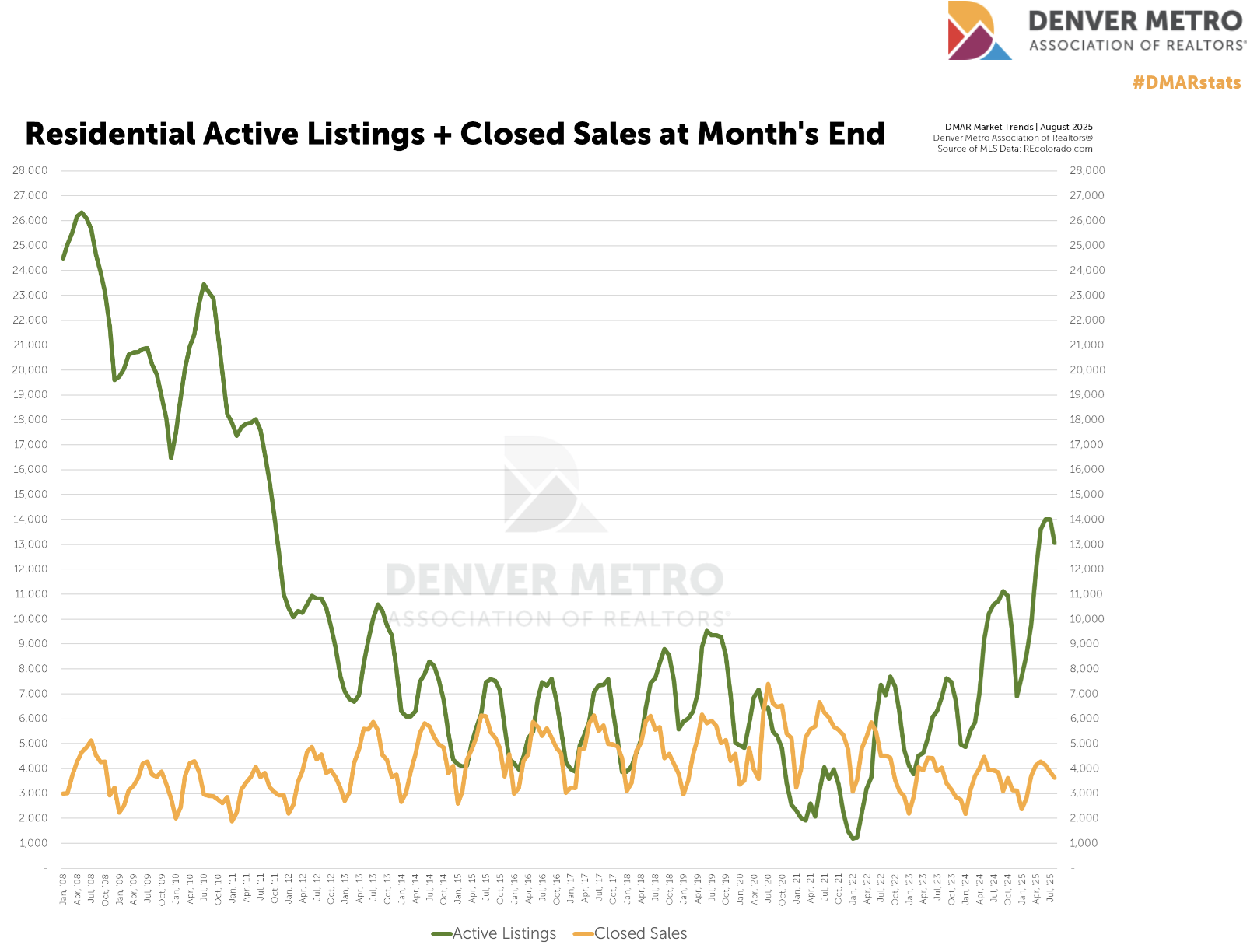| | If you read my newsletters often, you've seen this evolving chart more than once. For the newbies, the green line represents Active Listings. As we sit today, there are approximately 13,000 homes for sale on the Denver Metro market. Negating the past couple of months, we haven't seen numbers like that since 2012 (squint your eyes). But, I'd also like to point out that in 2012, Active Inventory was trending DOWN, in our market today, it's trending up. |