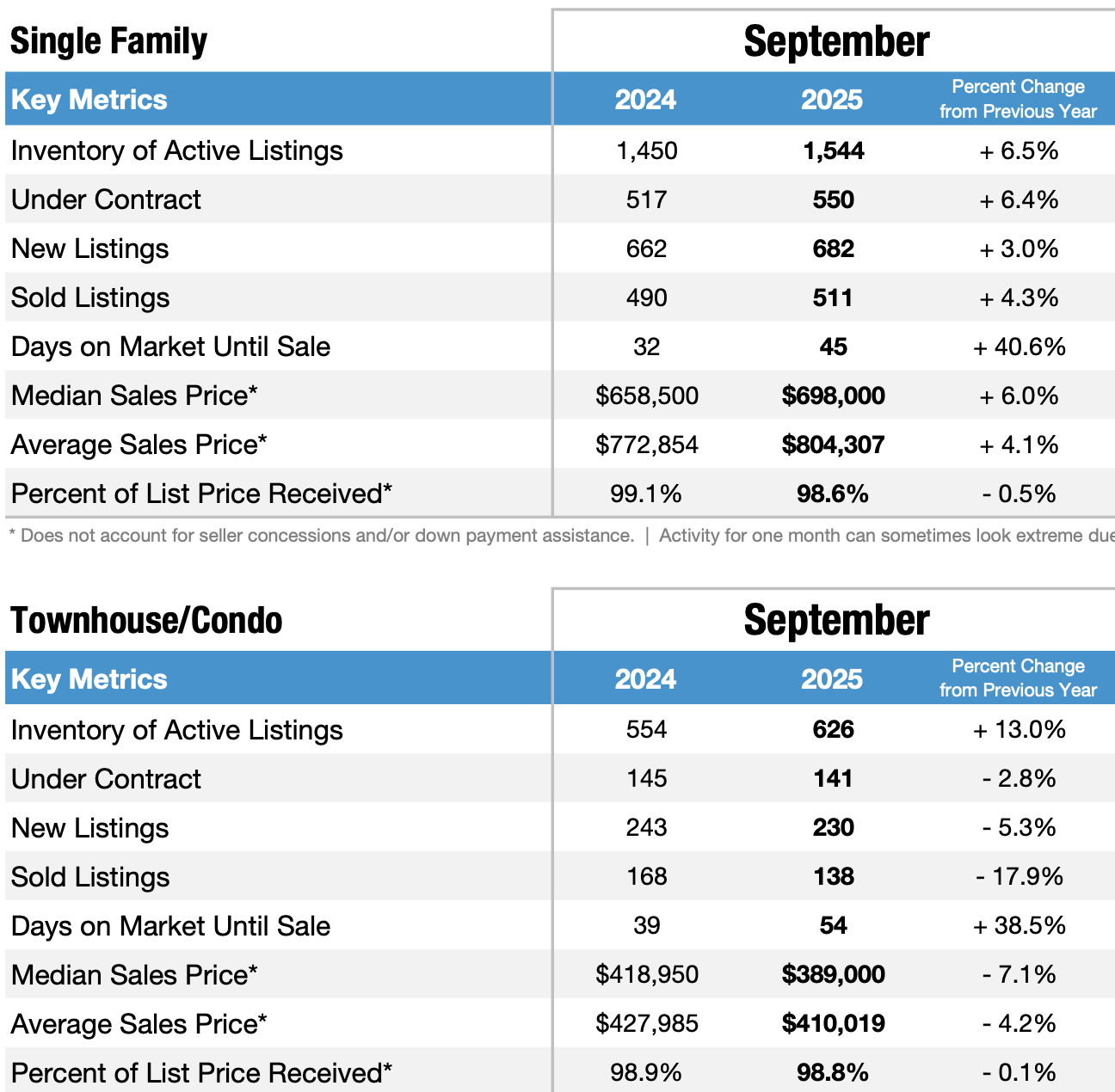 | | The numbers above are a reflection of only Jefferson County. Some interesting things to consider are how long properties are taking to sell. In comparison to September 2024, detached homes went from 32 days to 45 and attached (condos/townhomes) went from 39 to 54. We'll jump into a little more detail on this below, but let's first take a look overall inventory to understand why it's taking so much longer to sell your home. |