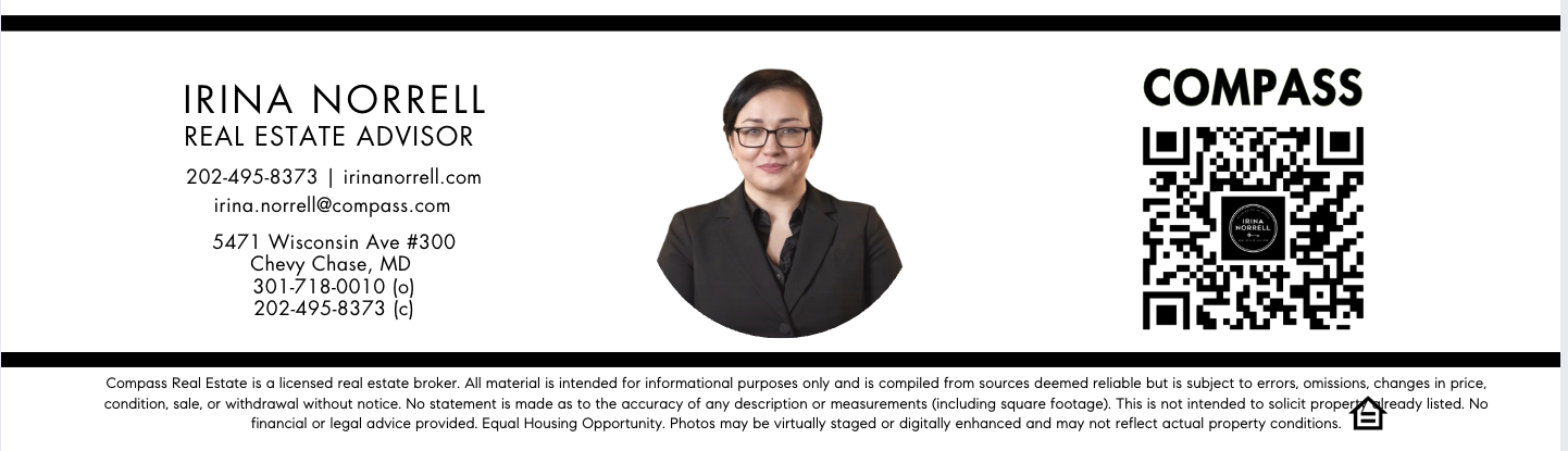 Office: 301-298-1001 Compass Real Estate is a licensed real estate broker. All material is intended for informational purposes only and is compiled from sources deemed reliable but is subject to errors, omissions, changes in price, condition, sale, or withdrawal without notice. No statement is made as to the accuracy of any description or measurements (including square footage). This is not intended to solicit property already listed. No financial or legal advice provided. Equal Housing Opportunity. Photos may be virtually staged or digitally enhanced and may not reflect actual property conditions. |